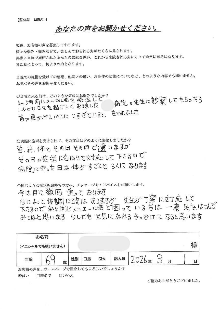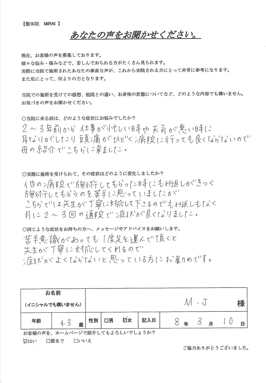 施術に関しては、こちらの話を聞いてくれ、的を捉えた箇所に対してアプローチをしてくれます。また、症状が緩和してきた中でも、更に改善を目指そうと努力をしてくれます。知識面もこちらの質問に対して真摯に聞き受けてくれ、豊富な知識から真剣に応えてくれます。何をしているのか分からないまま施術を受けることは不安ですから、その点も安心して施術を受けることが出来ました。