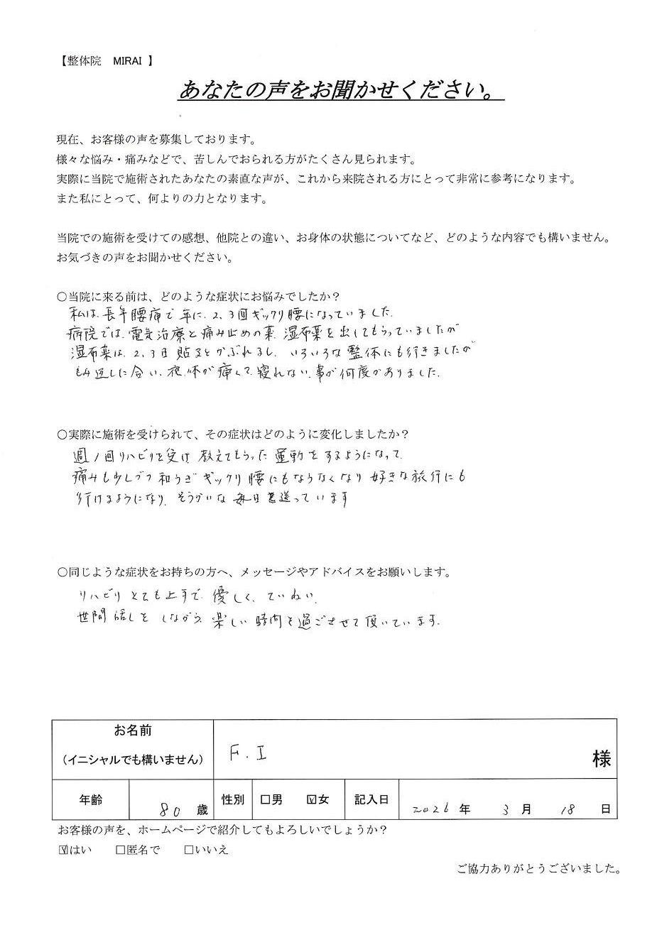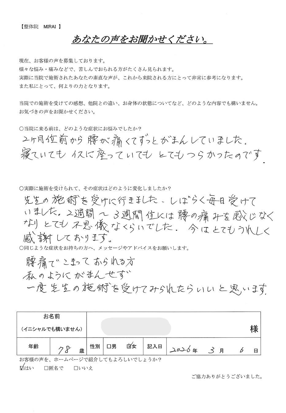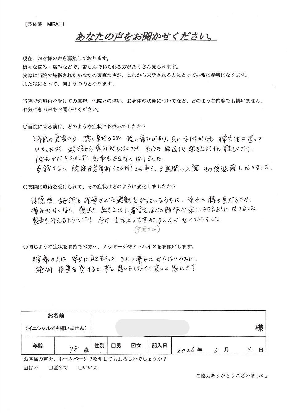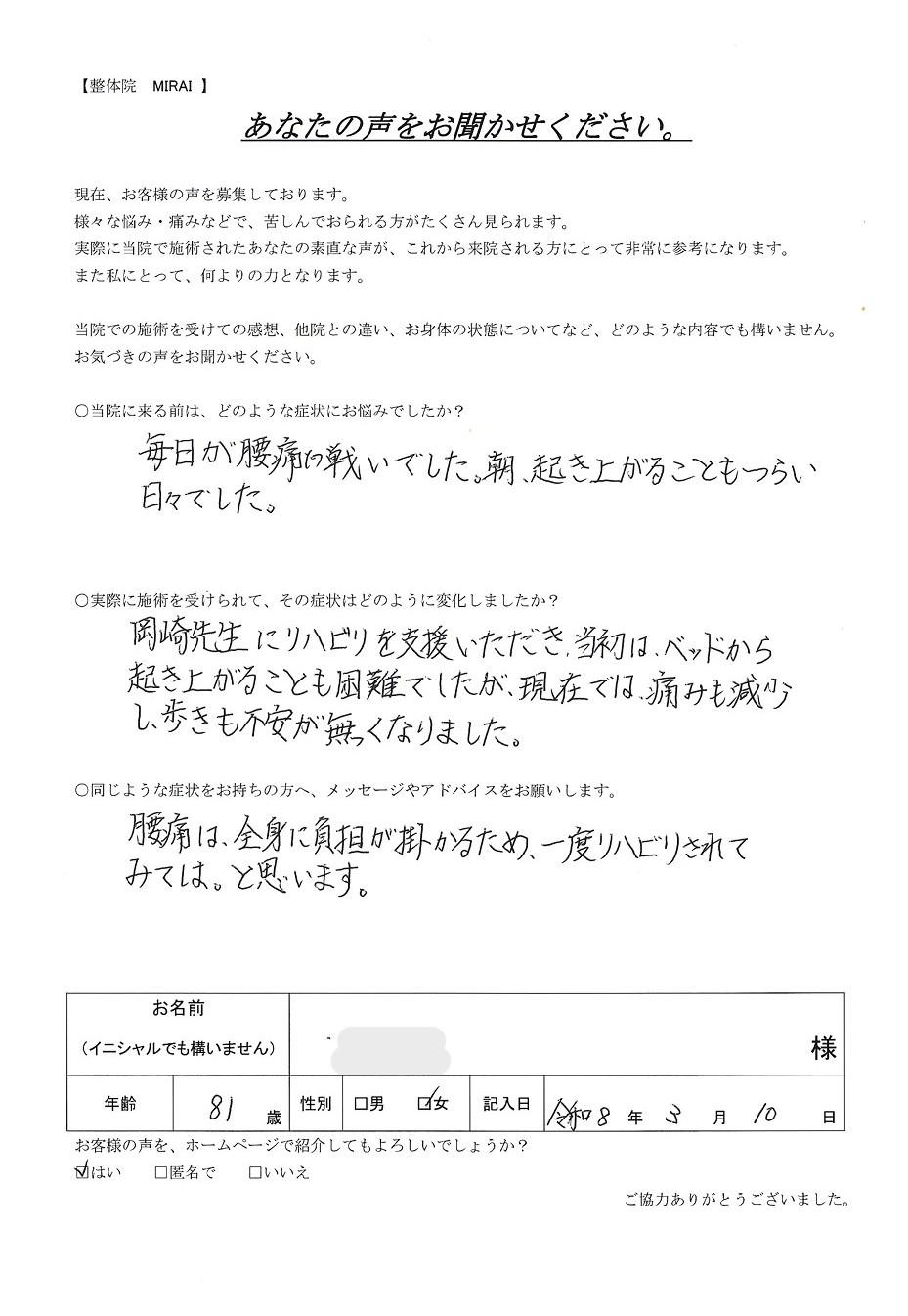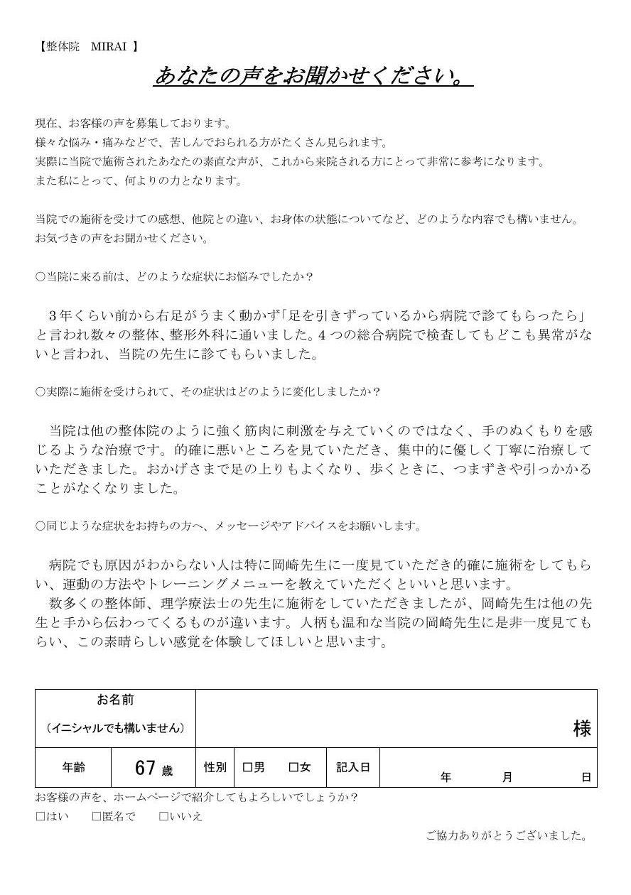 もし、私の大切な家族や両親が腰や膝が痛いと不調があったら、ぜひ岡崎さんに治療していただきたいと思える理学療法士です。安心して任せられます!