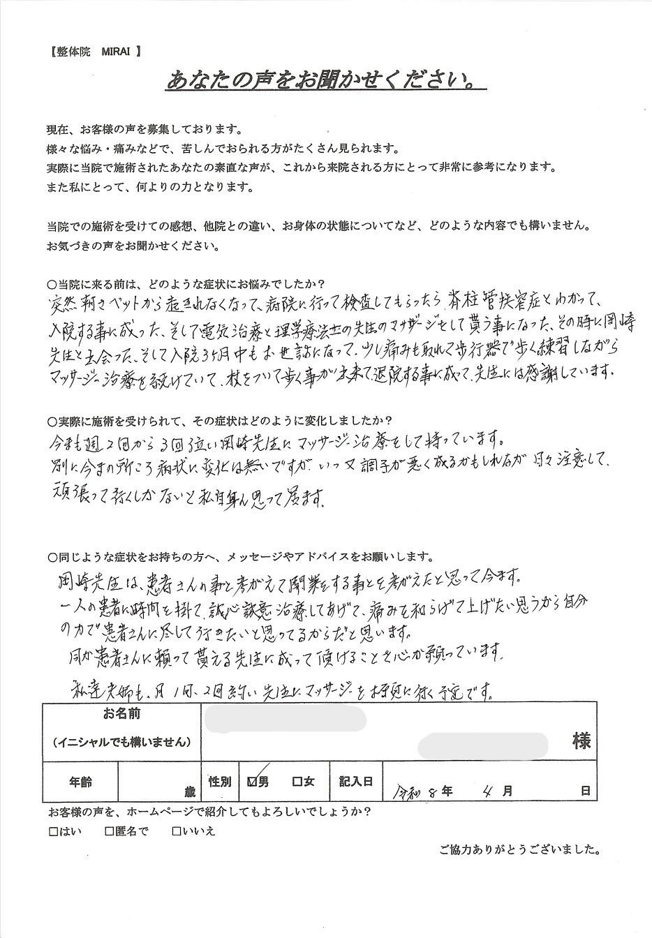 岡崎先生には競輪のレースで落車し、肩甲骨や肋骨、脊椎の圧迫骨折を受傷した際に担当していただき、施術を受けました。退院後も施術を受けています。他の整形外科や整体院の先生の施術も受けたことはありますが、彼は他とは違い話し易く、人柄がいいです。会ってみれば分かります。